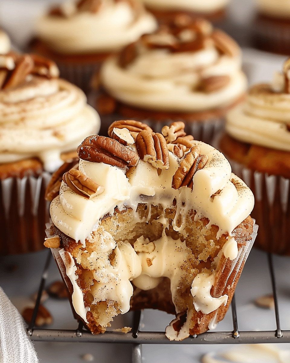- Frost & Serve: Once the cupcakes are completely cooled, frost them with the cream cheese frosting. Optionally, garnish with extra pecans or a sprinkle of cinnamon.