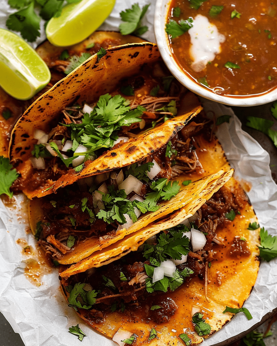 Flavor-packed Birria Tacos made with tender beef simmered in a rich, chili-infused consommé. Served crispy and cheesy with a side of savory broth for dipping—perfect for a bold, comforting Mexican meal.
