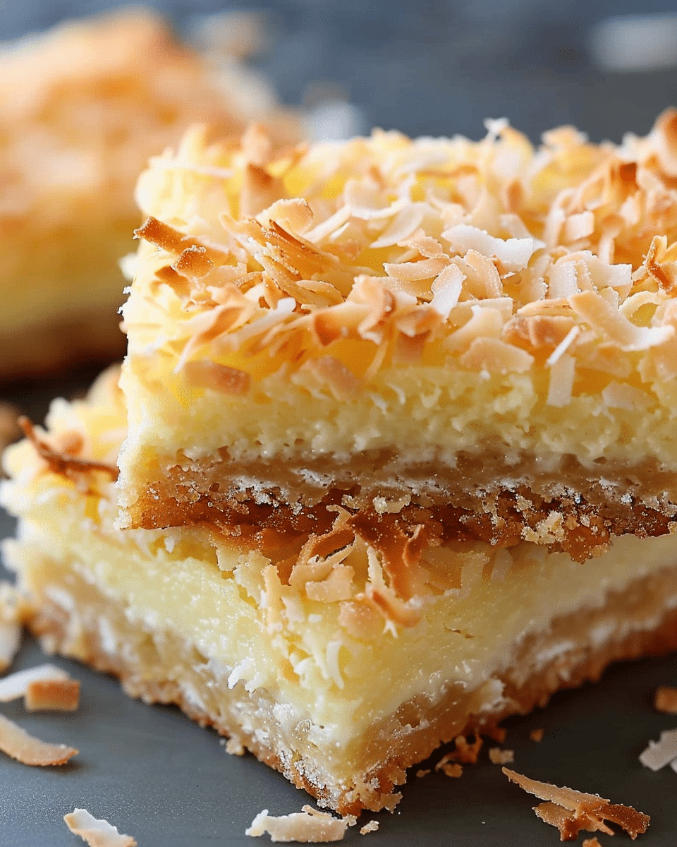 Rich, chewy, and irresistibly delicious, these buttery coconut bars combine a melt-in-your-mouth shortbread crust with a sweet, toasted coconut topping. The contrast between the crisp base and the chewy topping makes each bite satisfying and packed with flavor.