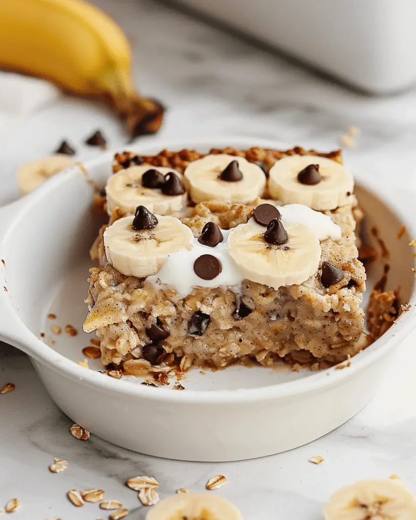 Baked Banana Chocolate Chip Oatmeal a delightful blend of ripe bananas and rich chocolate chips baked into hearty oatmeal, creating …