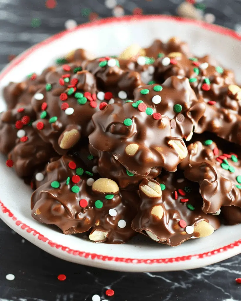 Crockpot Candy a deliciously simple and indulgent treat made with rich chocolate, crunchy peanuts, and festive sprinkles. Perfect for holiday …