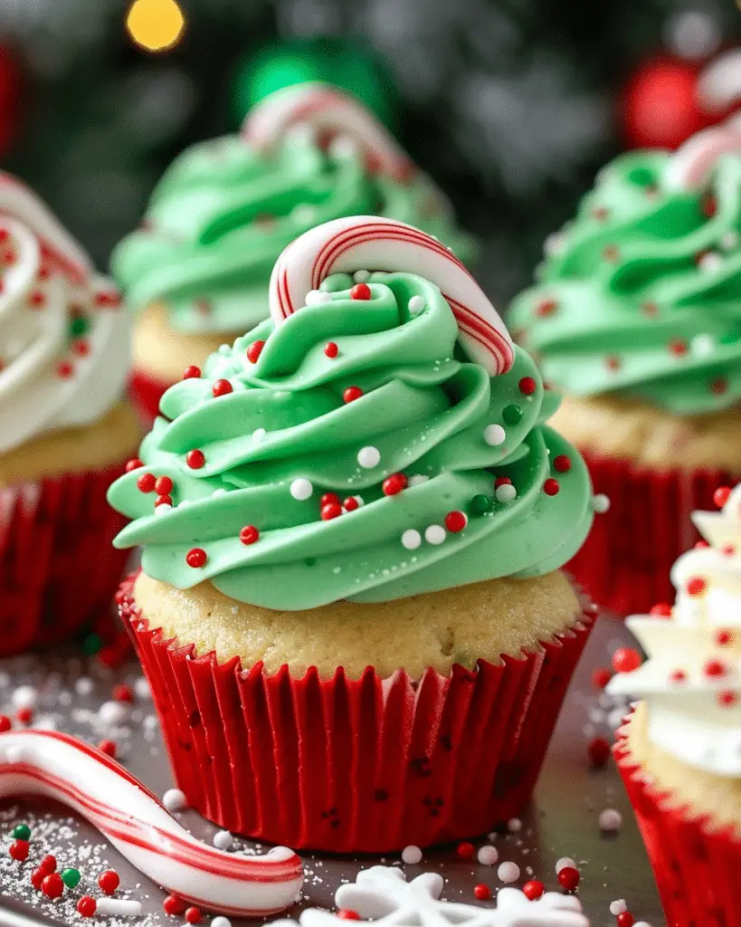 Festive Easy Christmas Cupcakes featuring vanilla base, vibrant green buttercream frosting, and cheerful decorations like candy canes and sprinkles. Perfect …