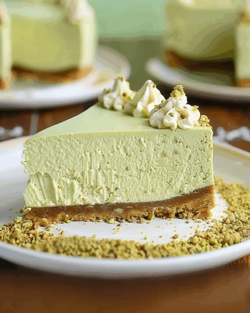 Indulge in a rich, creamy pistachio cheesecake with a buttery graham cracker crust, a burst of nutty flavor, and a …