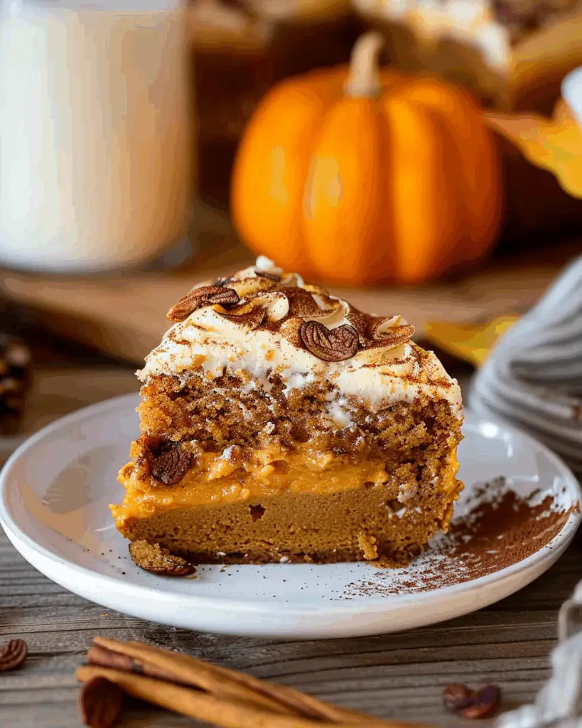 Spiced Pumpkin Earthquake Cake a decadent fall dessert that combines gooey, spiced pumpkin cake with creamy swirls of sweetened cream …