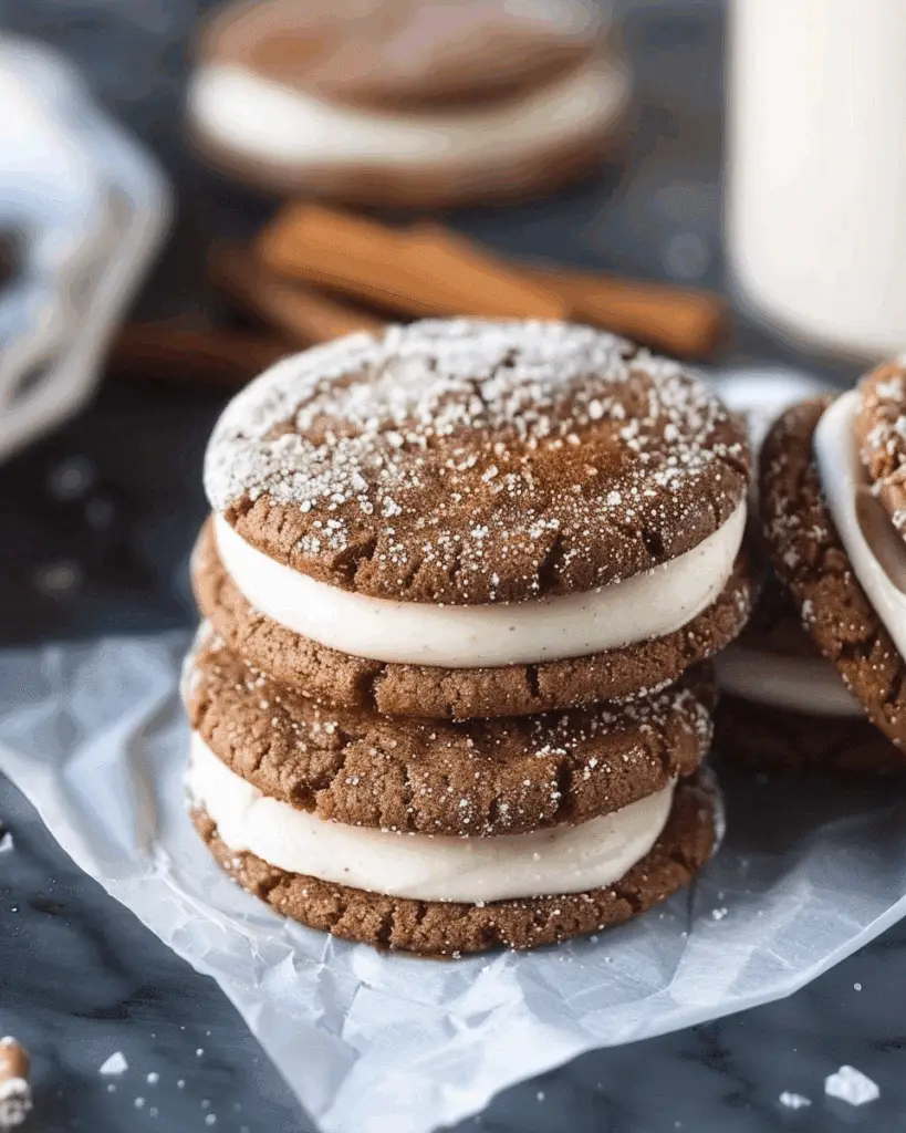 Soft, warmly spiced ginger molasses cookies filled with a luscious eggnog frosting — these sandwich cookies are everything I want …