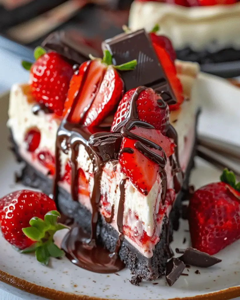 Indulge in a slice of pure bliss with this Chocolate Strawberry Cheesecake, featuring a rich chocolate cookie crust, a creamy …