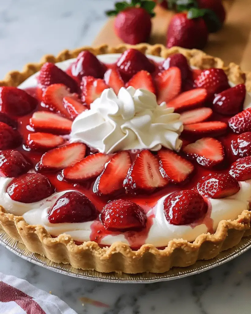 A luscious no-bake strawberry cheesecake pie featuring a creamy vanilla-infused cream cheese layer, fresh strawberries, and a sweet Jell-O glaze, …