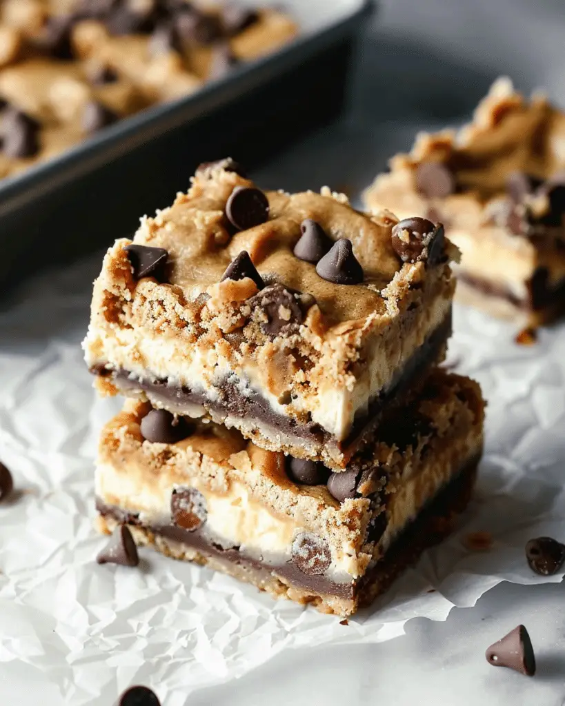 Peanut Butter Chocolate Chip Cookie Cheesecake Bars combine creamy cheesecake, peanut butter cookie dough, and mini chocolate chips in one …