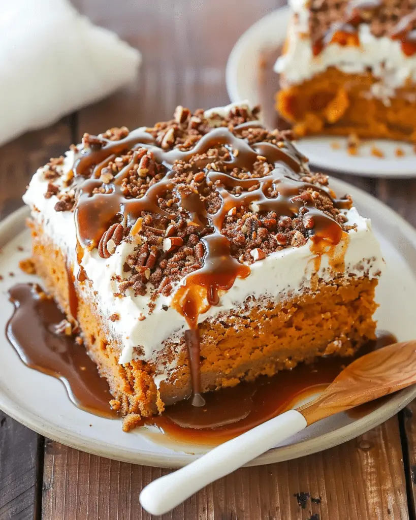 Pumpkin Caramel Poke Cake a moist and spiced pumpkin cake infused with caramel sauce and topped with creamy whipped topping, …