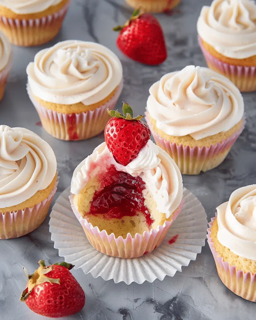 Strawberry Filled Cupcakes a soft and tender vanilla cupcakes with a luscious strawberry filling and creamy frosting make these cupcakes …