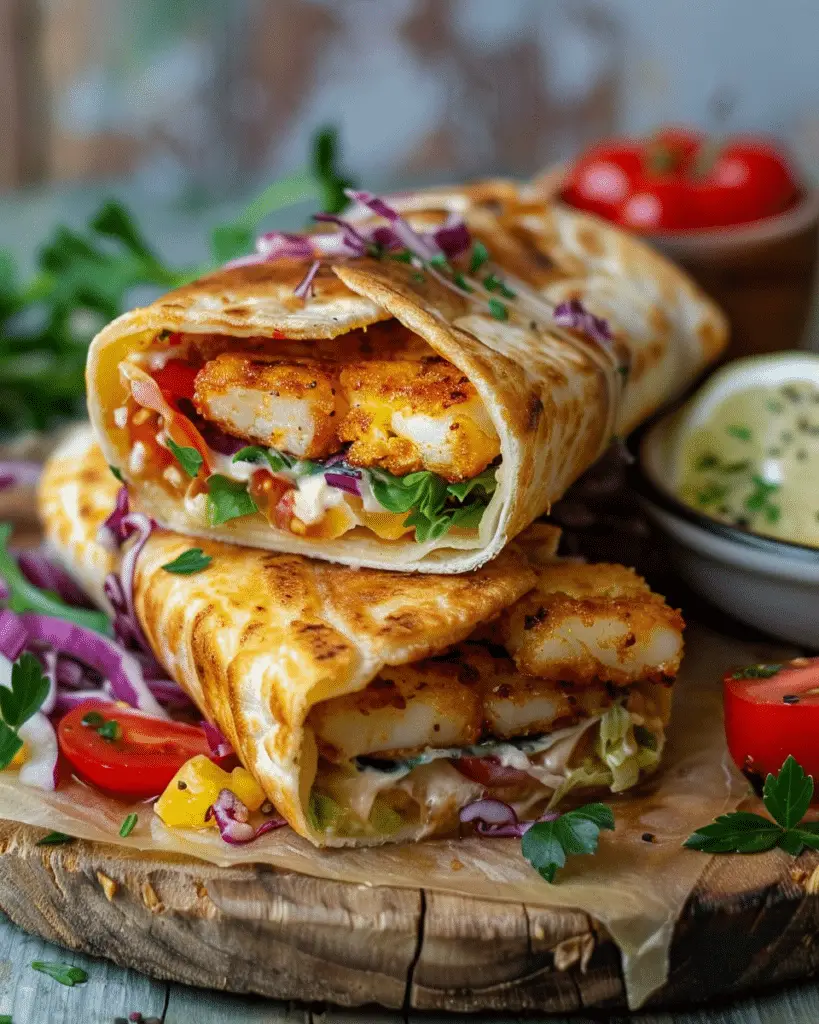 Golden, pan-fried Crispy Halloumi Wraps in warm flatbreads with tangy garlic yogurt, crunchy vegetables, and a drizzle of sweet chili …