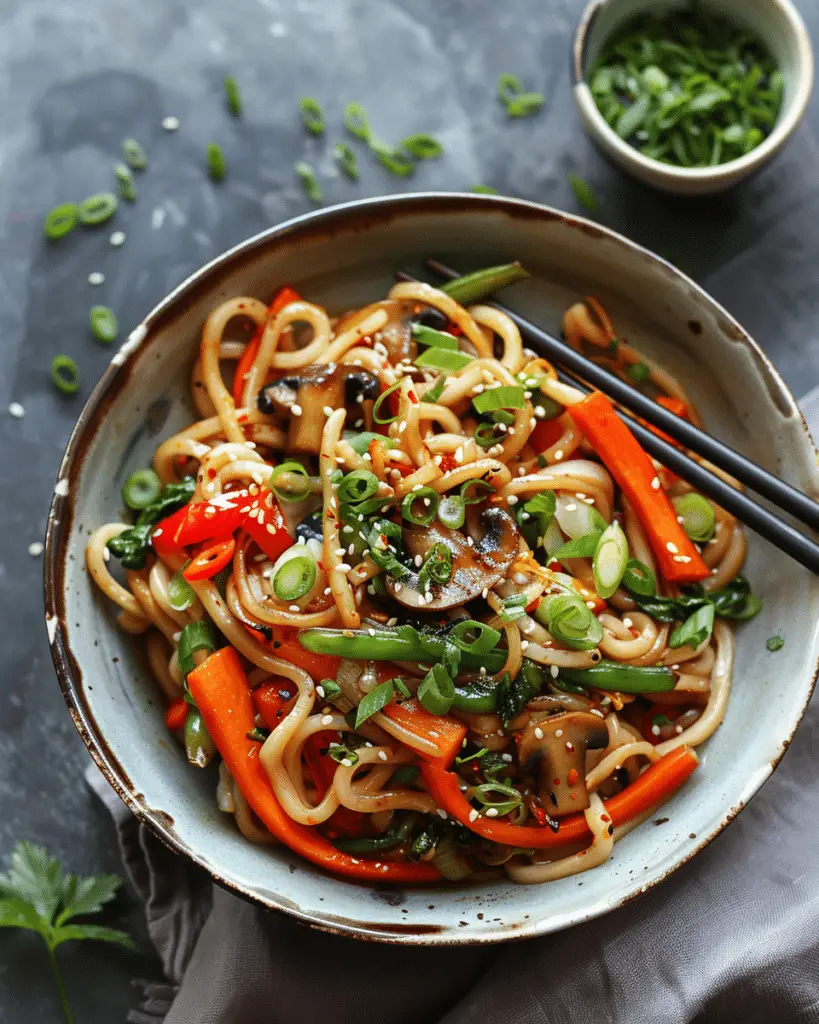 Yaki Udon Noodles with Savory Stir-Fried Vegetables a thick, chewy udon noodles come together with stir-fried vegetables and a deeply …