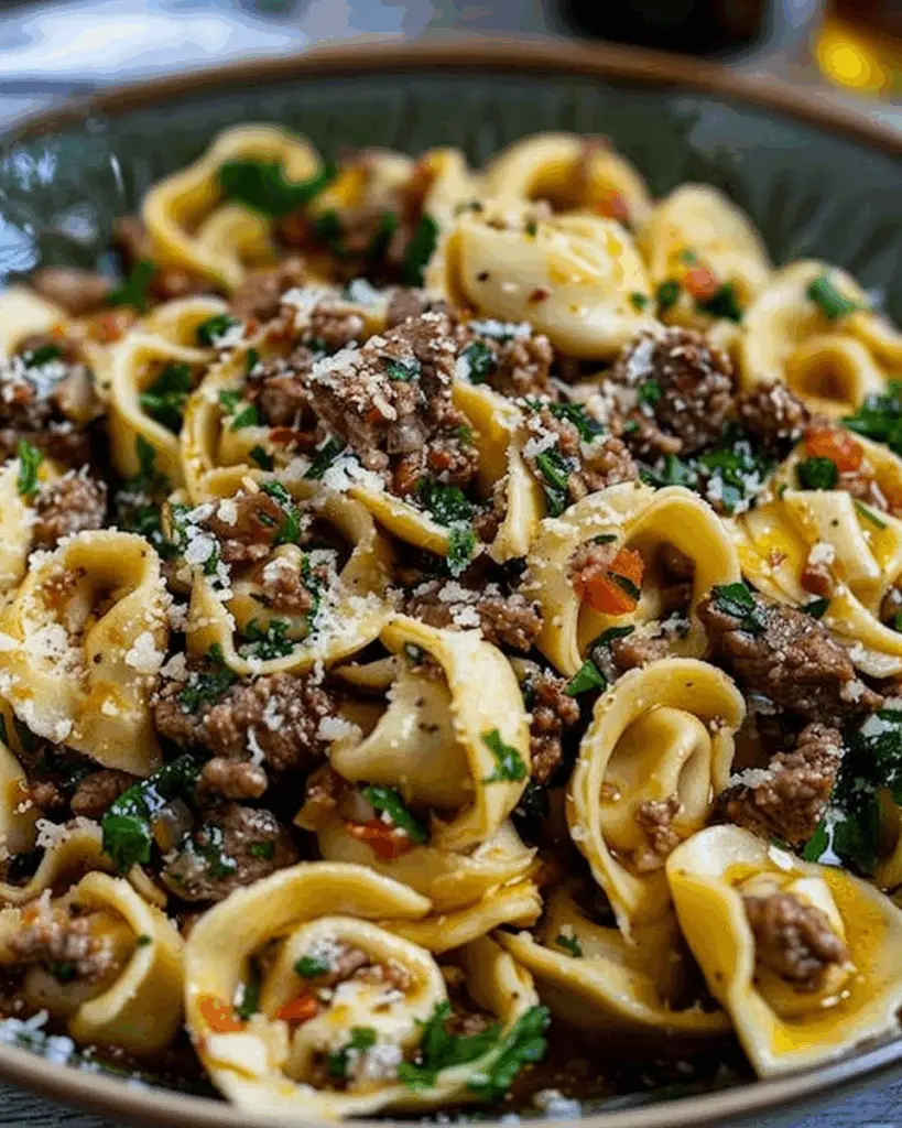 Tender cheese tortellini tossed with juicy ground beef in a rich garlic butter sauce — this Garlic Butter Beef Tortellini …
