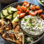 Chicken Tzatziki Bowls a refreshing and flavorful bowl featuring tender chicken, crisp veggies, and a creamy homemade tzatziki sauce. This dish is perfect for a healthy lunch or dinner, offering a balance of protein, fresh produce, and zesty flavors.