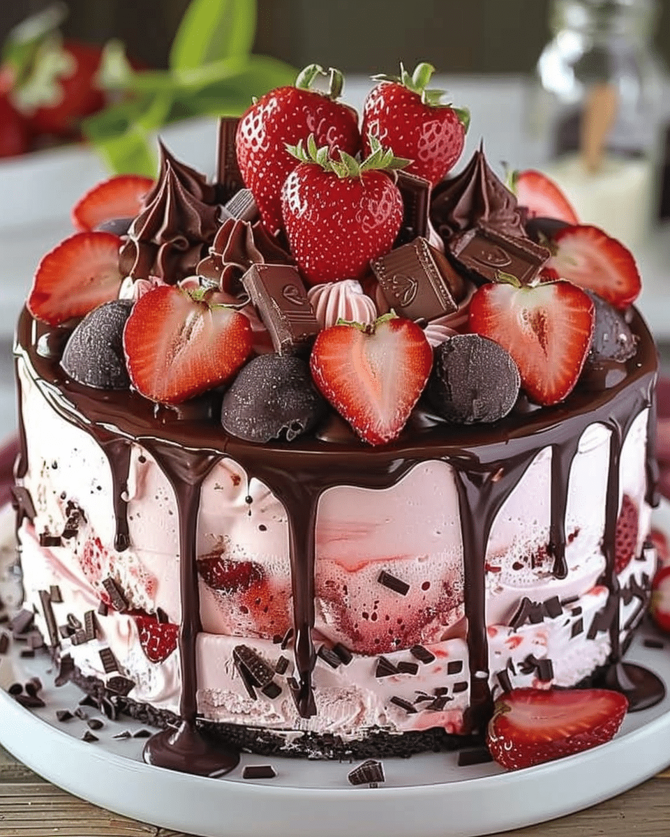 I love this recipe because it combines the best of both worlds: the deep, rich flavor of chocolate cake and the creamy, fruity freshness of strawberry ice cream. Each bite is a perfect blend of textures, from the soft and moist cake to the smooth and velvety ice cream. The glossy ganache drips over the cake, adding an extra layer of decadence, while the fresh strawberries on top bring a refreshing balance to the sweetness. Whether it’s a special occasion or just because, this cake is sure to be a crowd-pleaser.