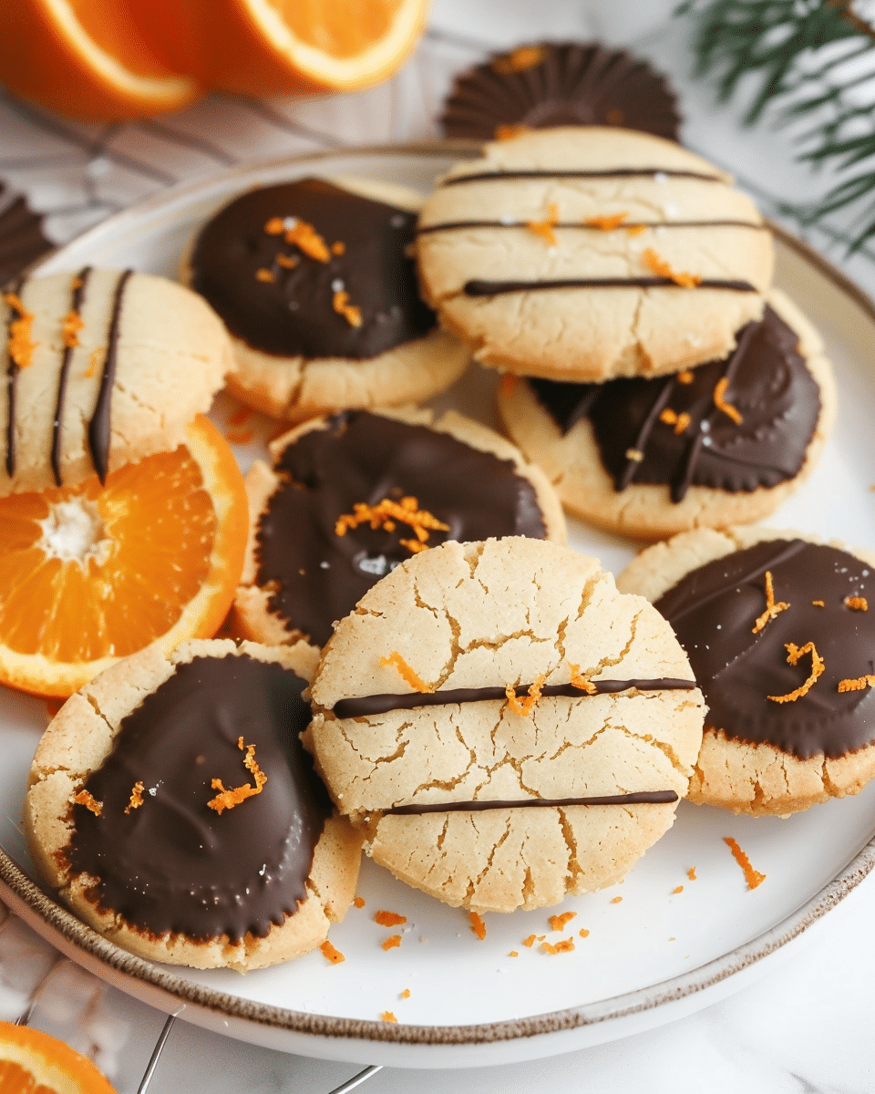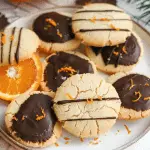 - Dip in Chocolate: Once cooled, dip half of each cookie in melted chocolate and place on parchment paper to set. Garnish with orange sprinkles or zest if desired.