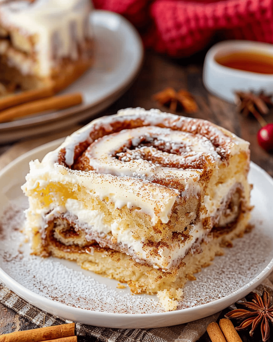 Freezing: The Cinnamon Roll Cake can be frozen for up to 3 months. To freeze, wrap individual slices or the entire cake (after it has completely cooled) tightly in plastic wrap, then place in a freezer-safe bag or container. Thaw in the refrigerator or at room temperature before serving. For a warm treat, heat thawed slices in the microwave for about 20-30 seconds.