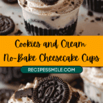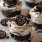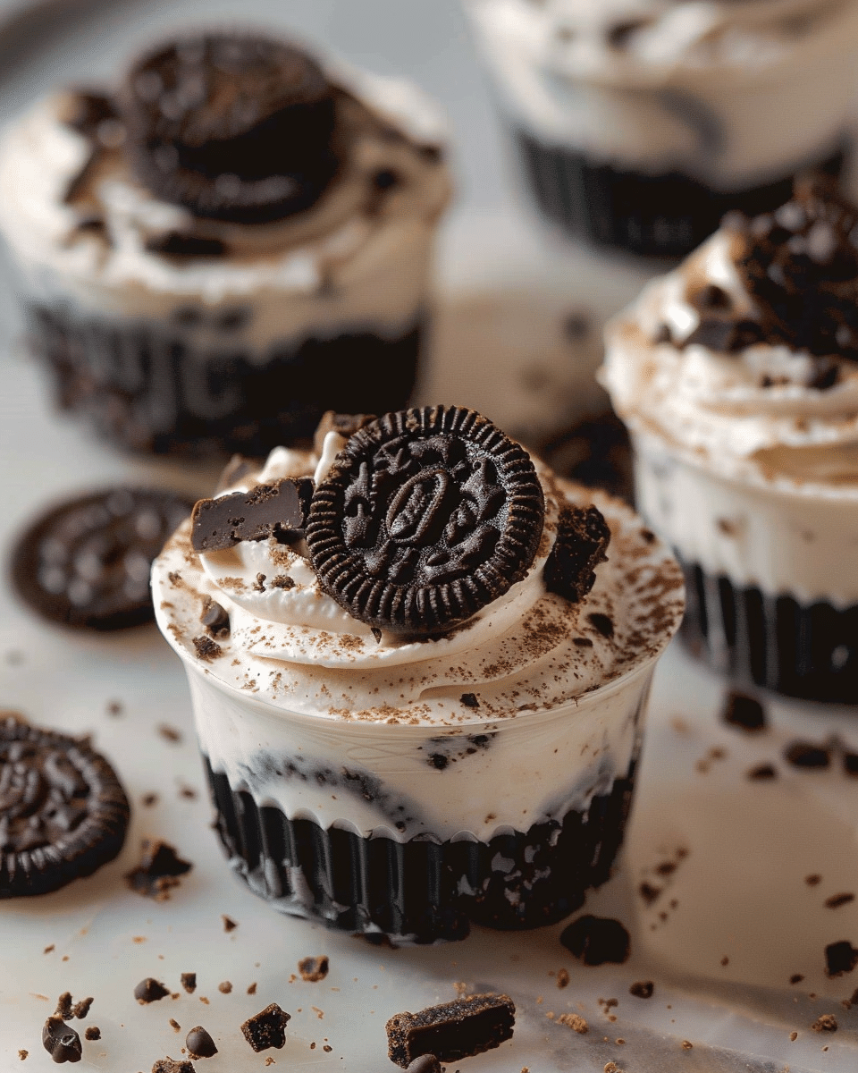 Dreamy and creamy no-bake cheesecake cups layered with crushed chocolate sandwich cookies and a velvety cheesecake filling, perfect for an easy, crowd-pleasing dessert.