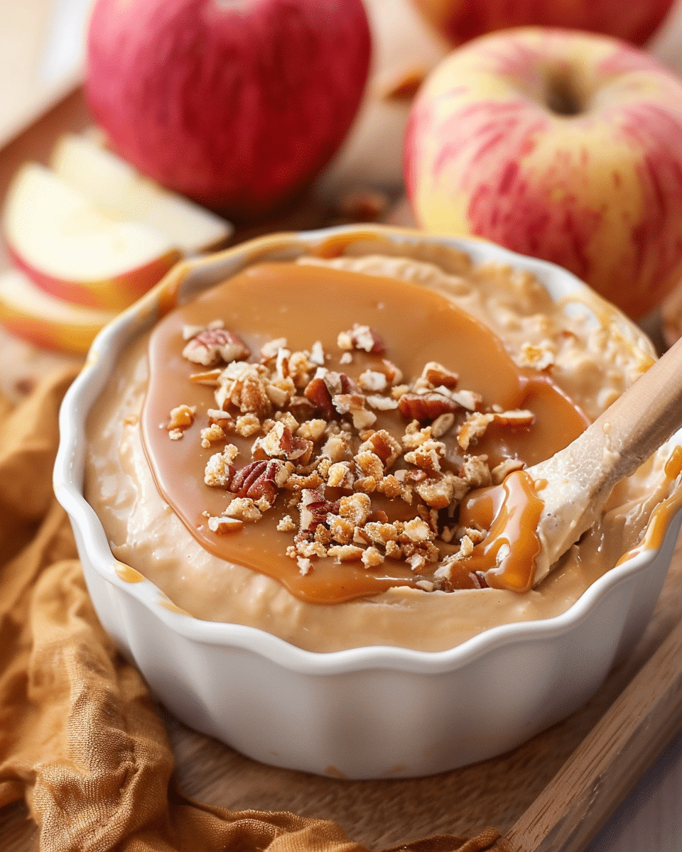 Serving Bowls: To enhance presentation, serve the dip in a decorative bowl and add some additional toppings like chopped pecans, toffee bits, or a drizzle of extra caramel sauce for extra appeal.