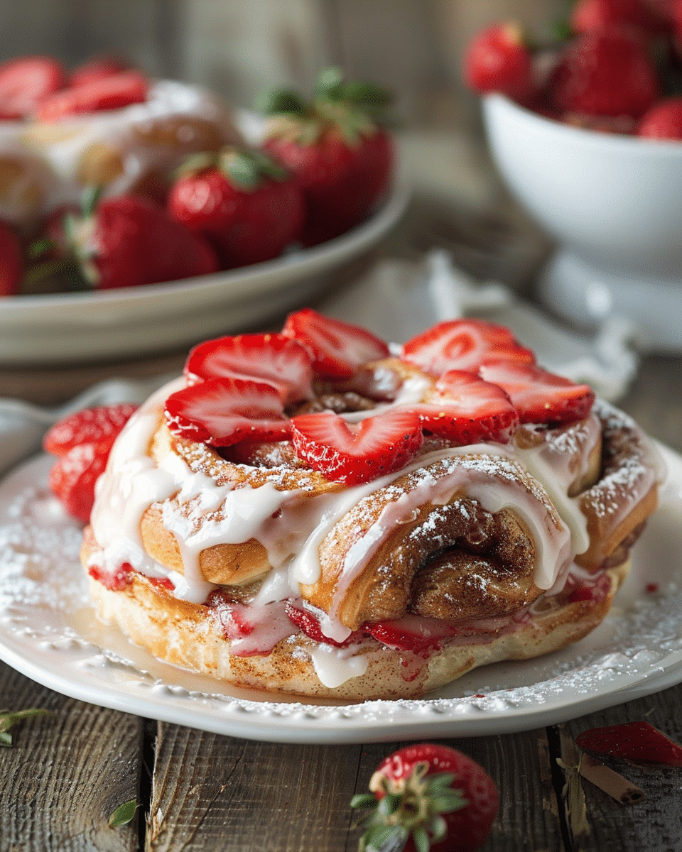 Soft and fluffy cinnamon rolls filled with a sweet strawberry-cinnamon mixture and topped with a light vanilla glaze. A fruity, vegan-friendly twist on the classic treat — perfect for brunch or a cozy weekend breakfast.