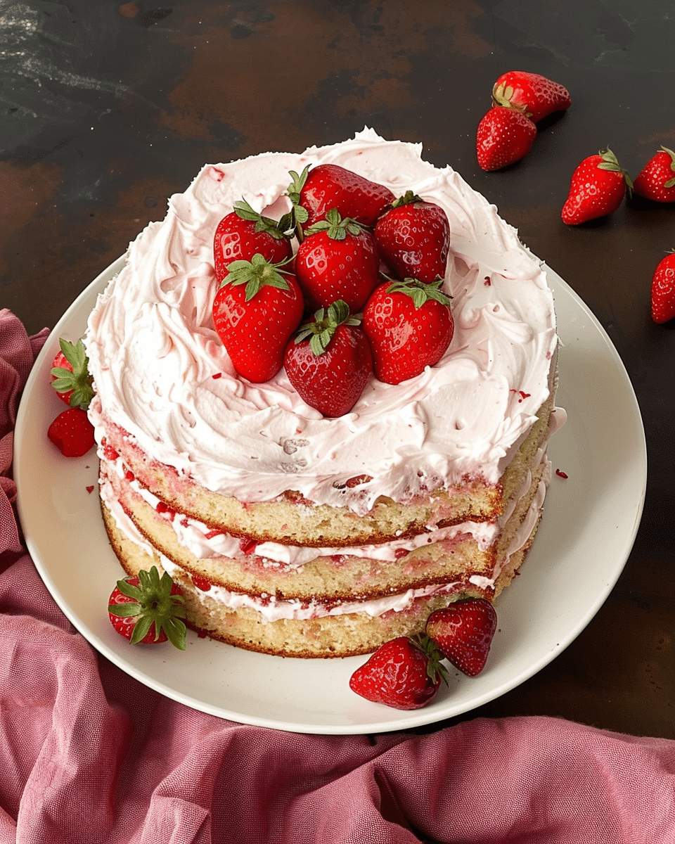 This Fresh Strawberry Cake is not only visually stunning but also bursting with flavor, making it the perfect centerpiece for your spring and summer celebrations. With its delightful combination of moist cake and creamy frosting, it’s sure to be a hit at any gathering. Try this recipe today and enjoy the taste of fresh strawberries in every slice!
