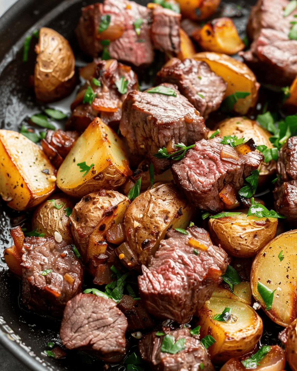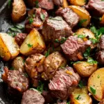 Savory and hearty one-pan Garlic Butter Beef Bites and Potatoes with tender sirloin cubes, crispy baby potatoes, and a rich garlic butter sauce. A comforting meal perfect for weeknights or weekends.