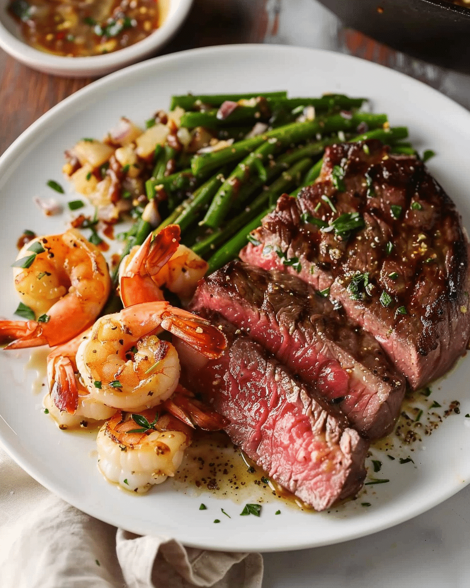 Enjoy a decadent surf-and-turf experience with this Garlic Butter Ribeye Steak and Shrimp recipe. Juicy ribeye and tender shrimp are perfectly seared and drizzled with a rich garlic butter sauce for a restaurant-quality meal at home.