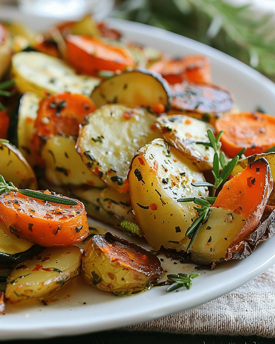 Serve: Enjoy the Garlic Herb Roasted Potatoes, Carrots, and Zucchini warm.