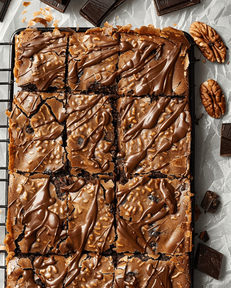 Rich and fudgy German Chocolate Brownies topped with a luscious coconut-pecan topping. This decadent dessert combines the classic flavors of chocolate, coconut, and pecans into a treat that’s perfect for any occasion. Easy to make and sure to impress, these brownies are a chocolate lover’s dream!