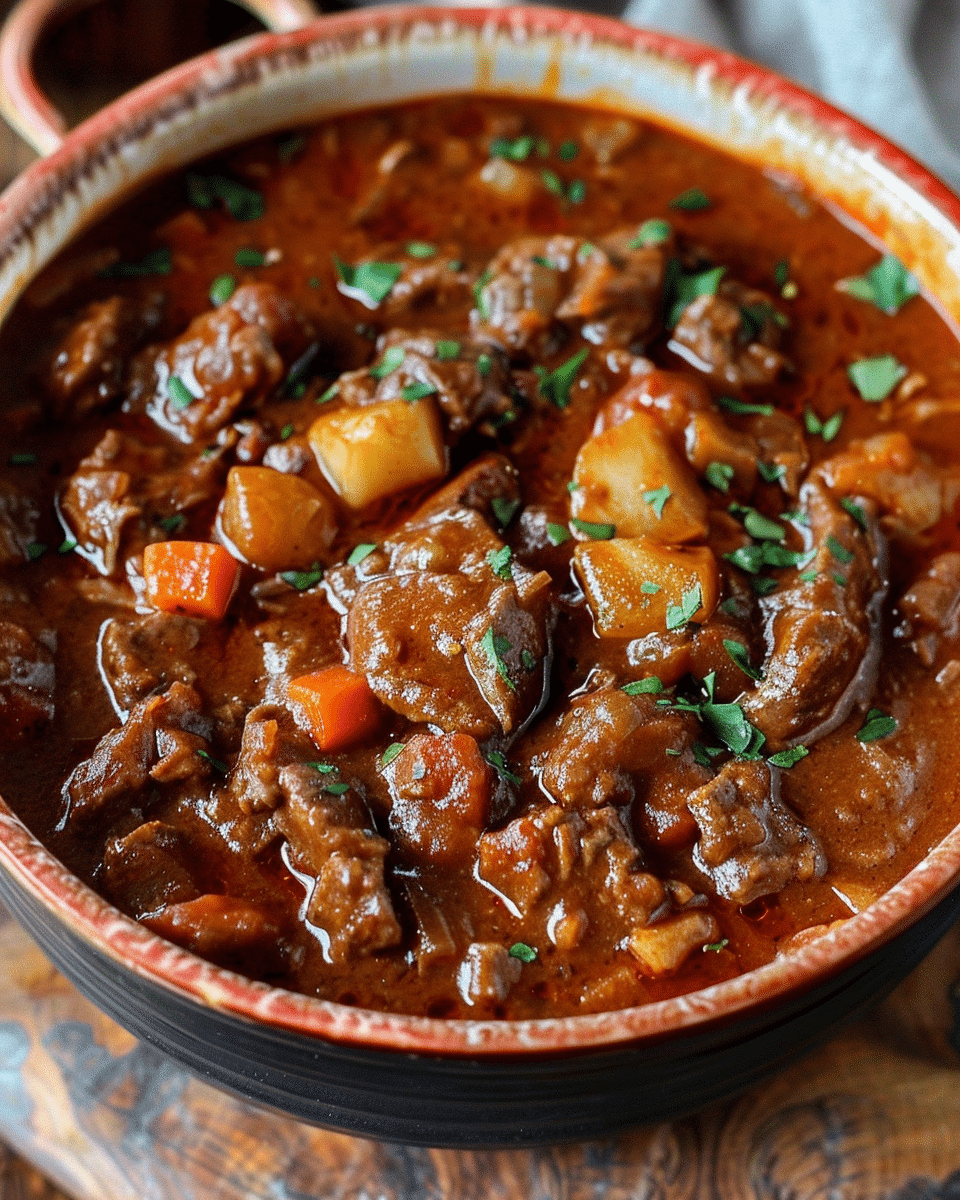 Sometimes I like to switch things up by adding root vegetables like carrots or parsnips in the last hour of cooking. If I want it spicier, I use a mix of sweet and hot paprika. I’ve also tried it with pork shoulder instead of beef, and it worked beautifully. For a thicker, stew-like finish, I occasionally stir in a tablespoon of flour or cornstarch slurry near the end.