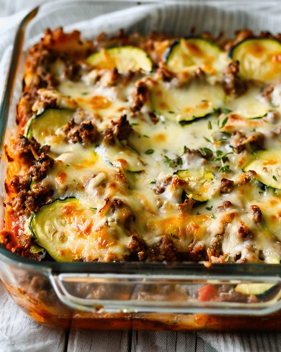 A hearty and healthy casserole made with ground beef, zucchini, and a blend of seasonings, topped with melted cheese for a comforting meal.