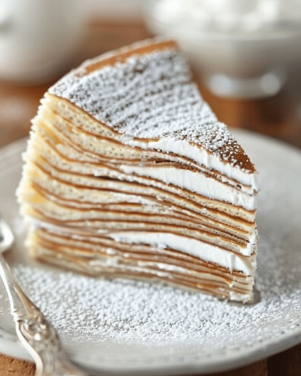 Presentation: Before serving, consider dusting the top of the Mille Crêpe Cake with powdered sugar or cocoa powder for an elegant touch. You can also add fresh berries or edible flowers for a pop of color.