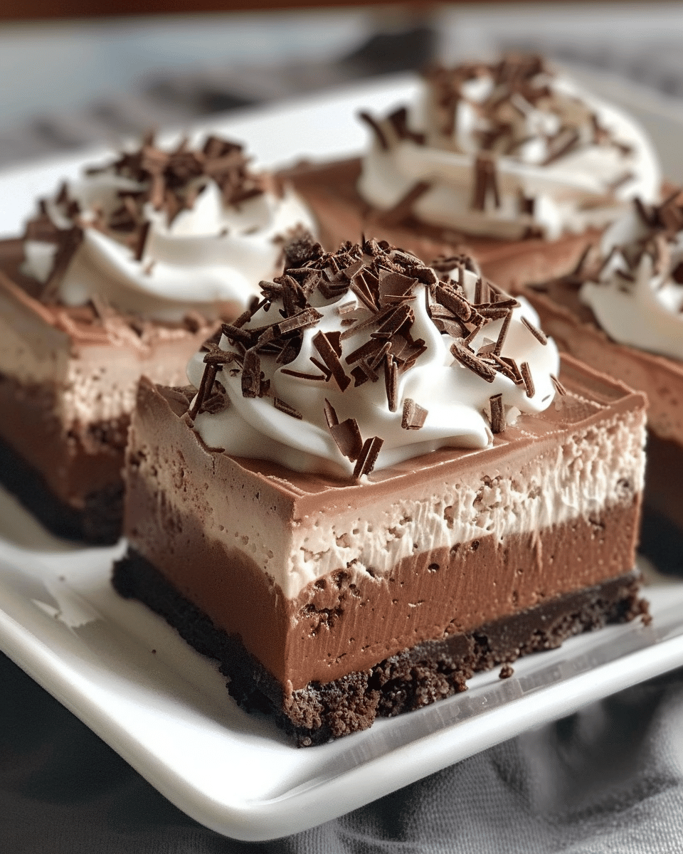 These triple-layered no-bake chocolate mousse bars are a dream dessert for chocolate lovers! With a crunchy chocolate cookie crust, an airy mousse filling, and a silky ganache topping, these indulgent bars come together effortlessly—no oven required. Perfect for parties, make-ahead desserts, or satisfying sweet cravings!
