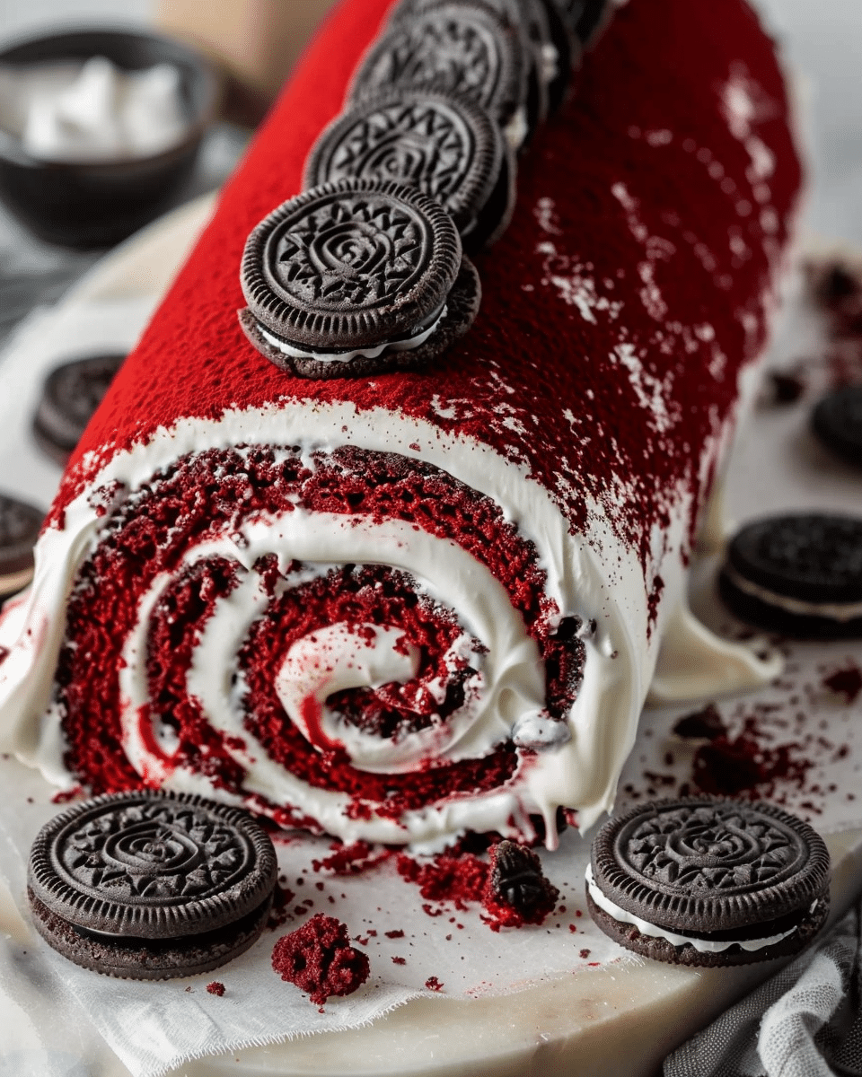 This Red Velvet Oreo Cake Roll is a delicious and visually impressive dessert that combines two of my favorite treats: red velvet cake and Oreos. With its rich, creamy filling and stunning swirl, it’s the ultimate dessert for any occasion. Whether you’re celebrating or simply indulging, this cake will be a hit!