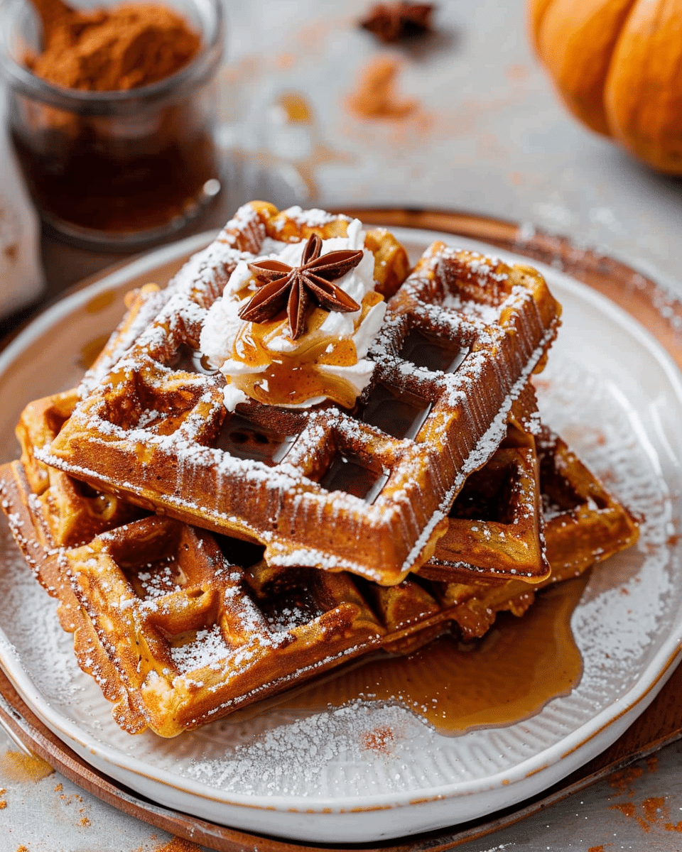 Fluffy, golden waffles infused with real pumpkin purée and warm spices, perfect for cozy fall mornings or weekend brunches.