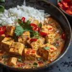 A rich and flavorful vegan dish featuring crispy tofu simmered in a creamy coconut sauce infused with chili, garlic, and ginger. Perfect for a comforting, spicy meal that’s quick enough for weeknights.