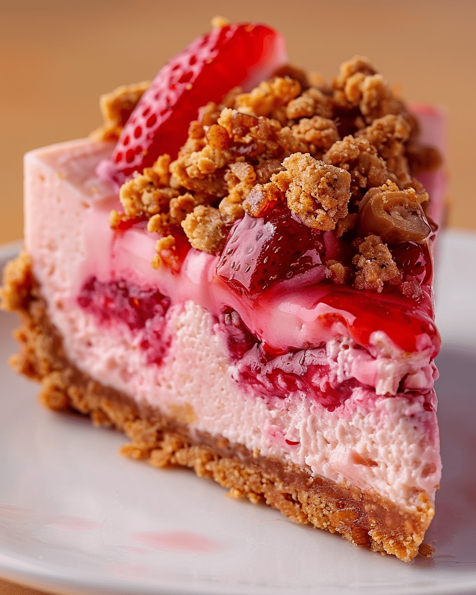Strawberry Crunch Cheesecake is an irresistible dessert that combines creamy layers with a buttery, crunchy topping. It’s perfect for impressing guests or treating yourself to a delightful indulgence. With its vibrant strawberry flavor and satisfying texture, it’s sure to become a favorite in your recipe collection.