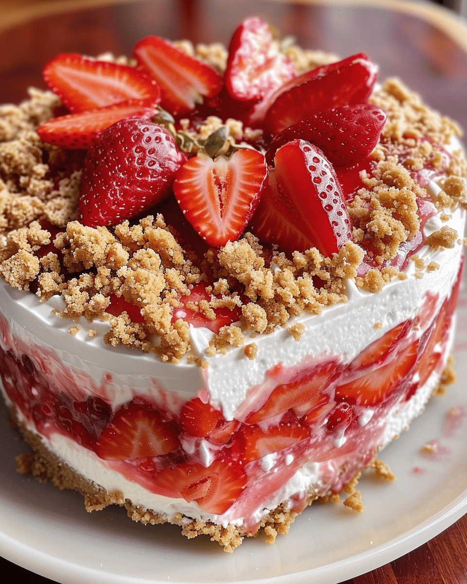 This no-bake Strawberry Delight Crunch Cake is a creamy, fruity dessert layered with fresh strawberries, crunchy graham crackers, and a rich cheesecake filling. Perfect for strawberry lovers, it’s a show-stopping treat for any occasion.