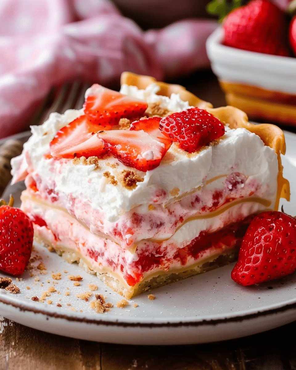 This Strawberry Lasagna recipe combines creamy cheesecake filling, fresh strawberries, and a buttery graham cracker crust for a refreshing, no-bake dessert that’s perfect for any occasion. This easy-to-make treat is ideal for warm days and gatherings, offering a light yet indulgent dessert without the need for baking. With customizable options like adding fruit or using a gluten-free crust, it’s a versatile and crowd-pleasing choice.
