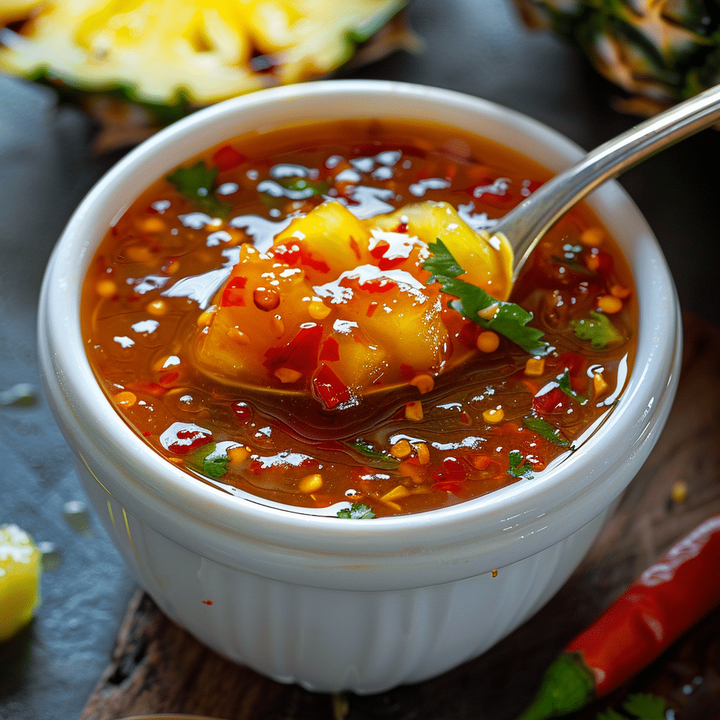 I recommend storing the Sweet Chili Pineapple Sauce in an airtight container in the fridge for up to a week. If I want to reheat it, I simply warm it on the stove over low heat, adding a splash of water if it’s too thick.