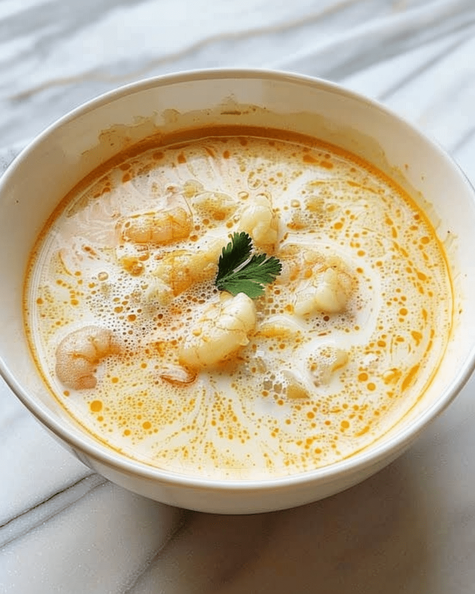 A rich and aromatic Thai coconut soup combining shrimp, shiitake mushrooms, and a balance of spicy, sweet, and savory flavors, perfect for any occasion.